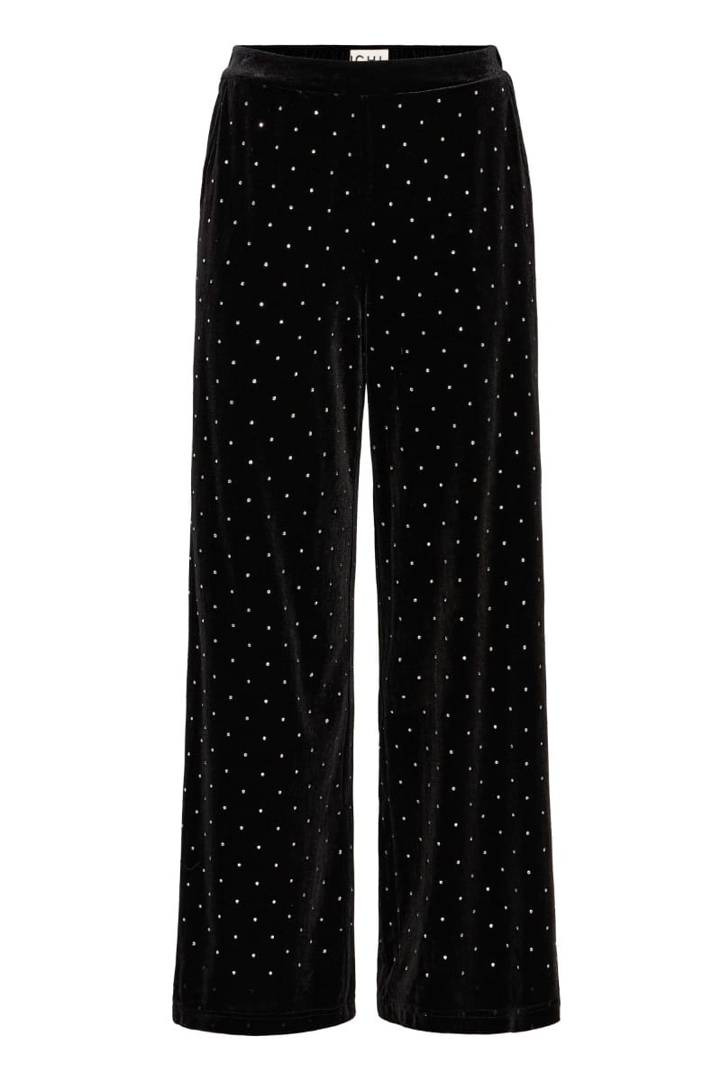 Bukser fra Ichi. Disse bukser har et velour look med rhinsten, som giver et festligt udtryk! Ønsker du et fuldendt sæt, så findes der matchende overdel.