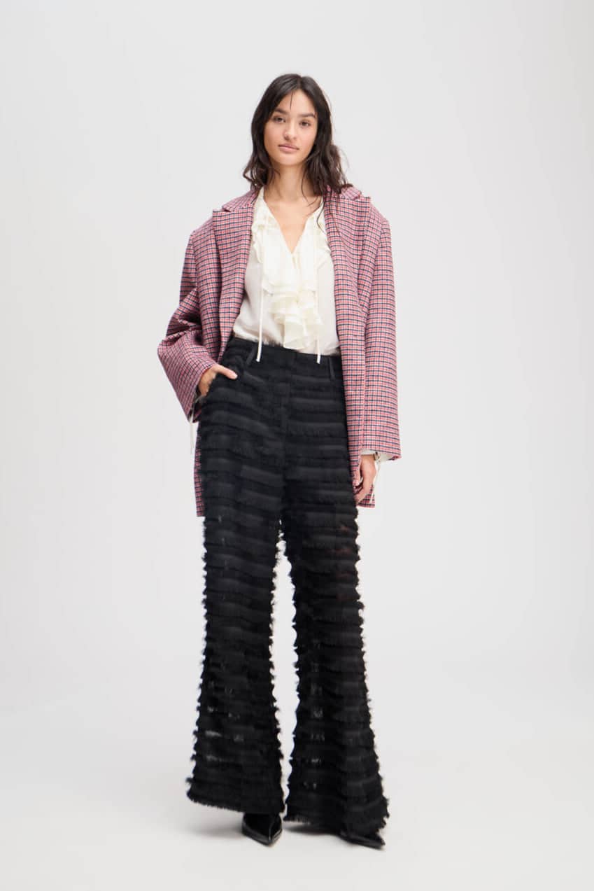 Elegante sorte bukser i let transparent kvalitet med smukke, fine frynsedetaljer. Designet med lynlåslukning, praktiske lommer, bæltestropper og flatterende brede ben for en moderne silhuet.