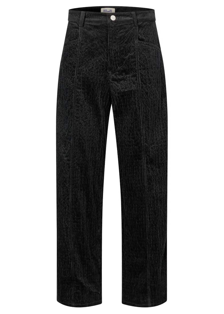 Disse sorte Nara bukser fra Baum und Pferdgarten er fremstillet i et fløjlsmateriale. Buskerne har et tidløst design med en høj talje, brede ben og en synlig søm foran og bagpå. Bagpå er bukserne designet med B på den ene baglomme og et P på den anden.