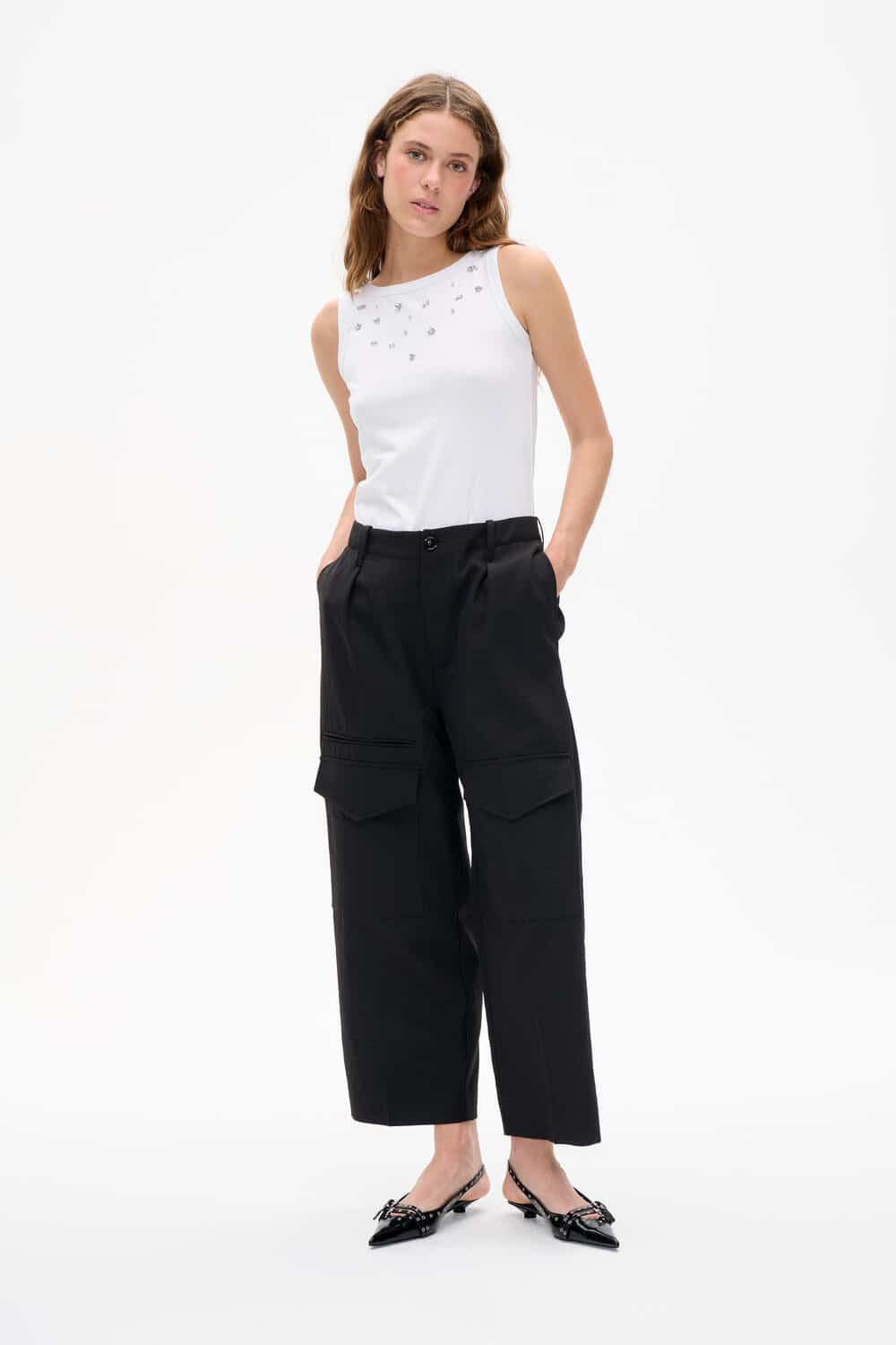 Neria bukserne fra Baum und Pferdgarten er et par klassiske bukser med læg foran og to store cargolommer på lårene. Bukserne har en klassisk lynlås- og knaplukning og er fremstillet i et let skinnende materiale.