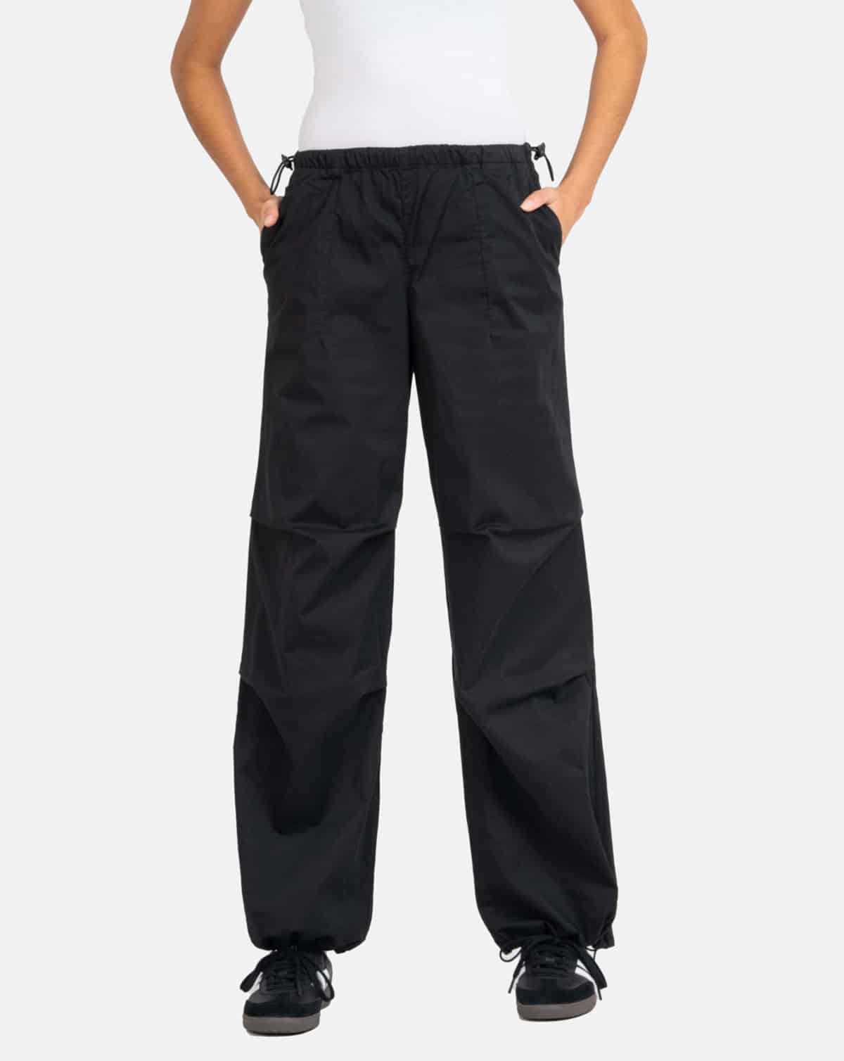 Women Parachute bukser giver en afslappet og bred pasform. Snøre med stopper i taljen og forneden giver bevægelsesfrihed. Baglommer på bagsiden efterlader fokus på det bløde satinstof, mens læg på knæet sikrer mere plads. Vores model (1,75 m) bærer XS/nor