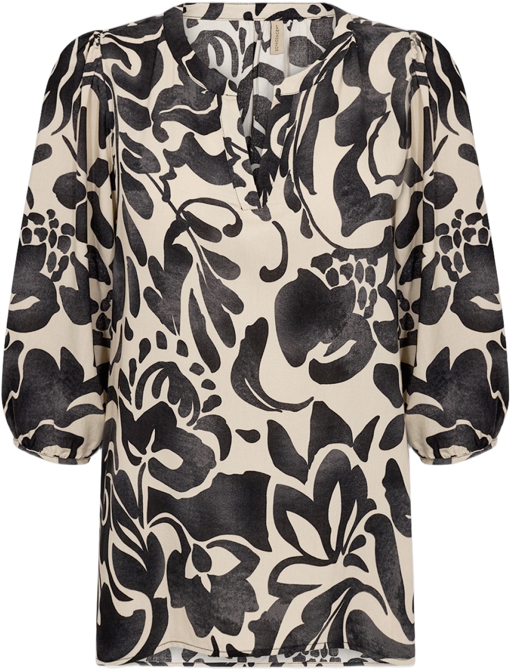 SC-SENTA 1 er en bluse fremstillet af 100% LENZING ECOVERO-viskose. Blusen har pufærmer, V-udskæring og et abstrakt blomsterprint hele vejen igennem. Sæt den sammen med skræddersyede bukser eller en denimnederdel for et stilfuldt look.
