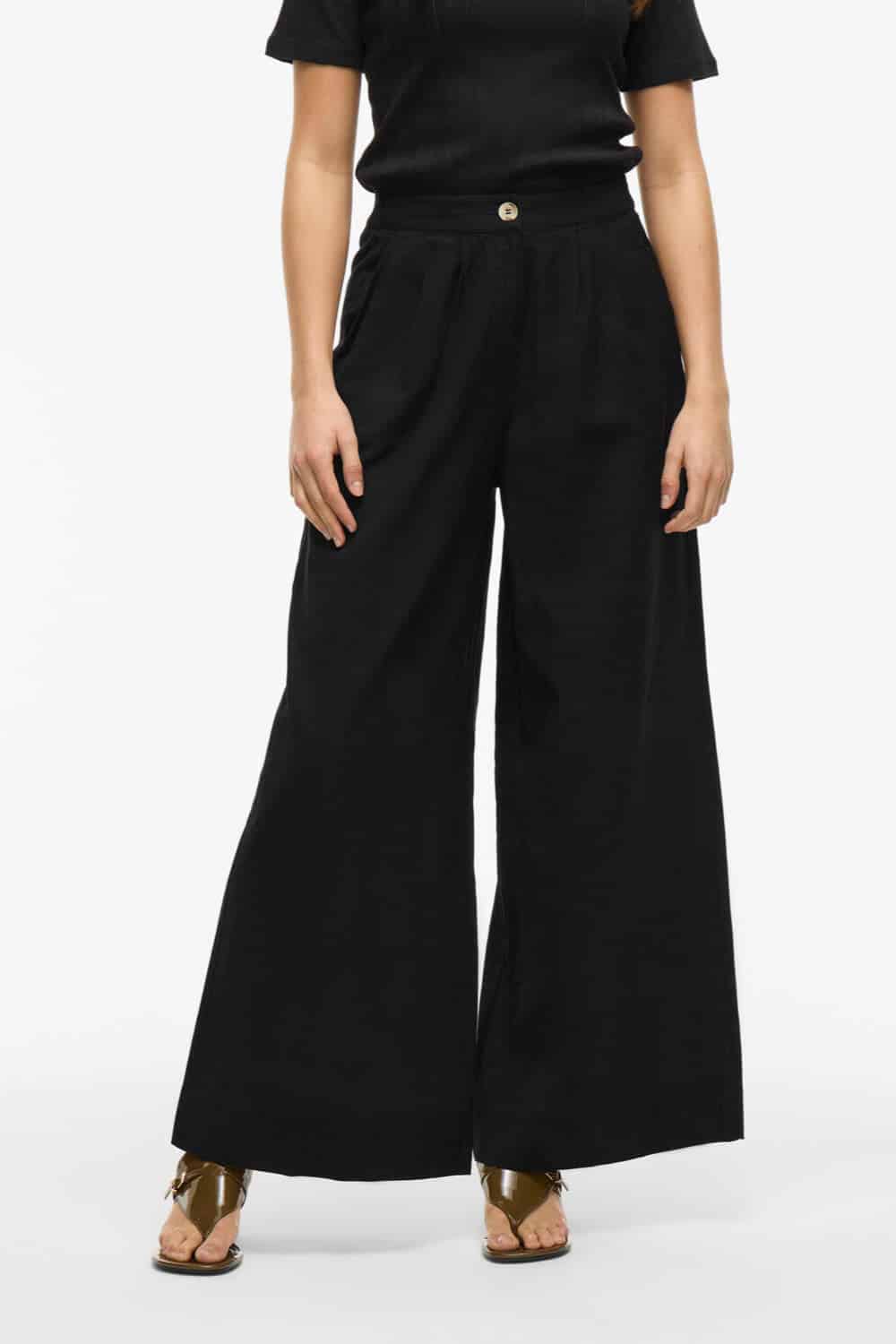 Vietni bukserne fra Vila er designet med en høj talje, brede ben og læg foran, som giver en flatterende silhuet og et moderne udtryk. Bukserne lukkes med en synlig knap foran og har sidelommer, som f