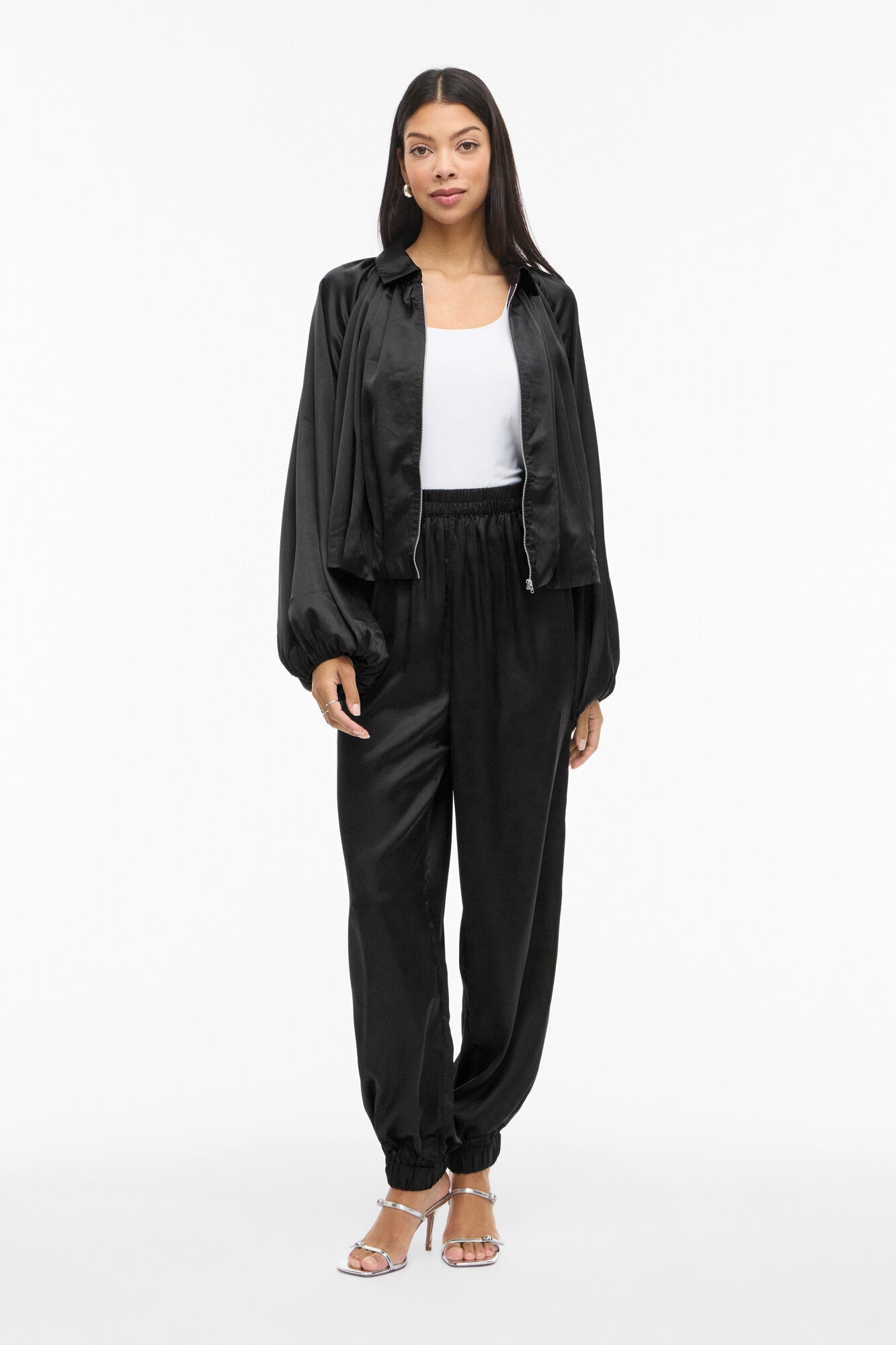 Disse bukser fra Vila er designet i et skinnende materiale med elastik i taljen og for enden af buksebenene. Bukserne har en løs pasform og høj talje.