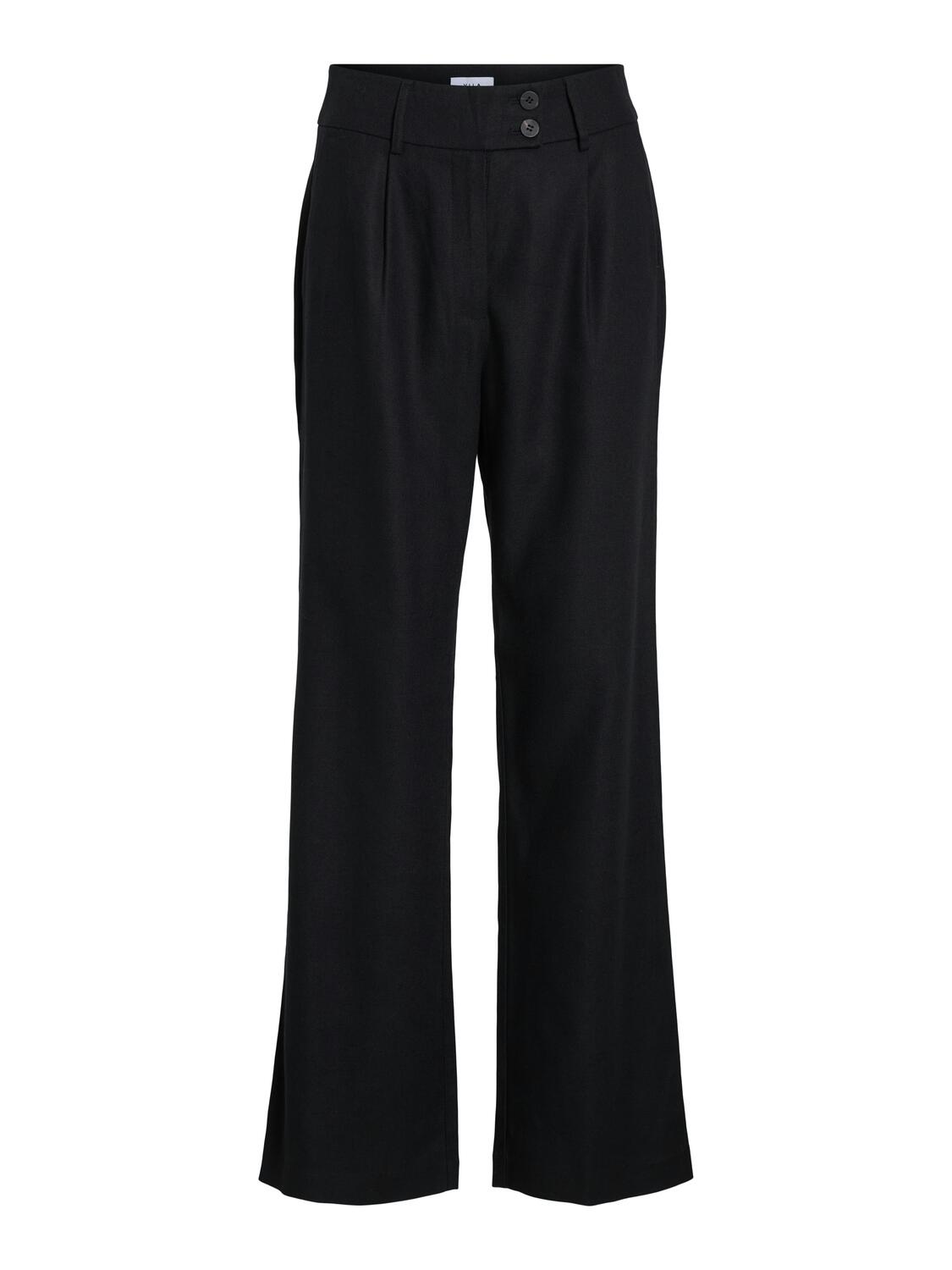 Denne vare udgår af sortiment og sælges til udsolgt. Klassiske sorte habitbukser med lige ben fra Vila. Bukserne lukkes med knap og har bæltestropper.