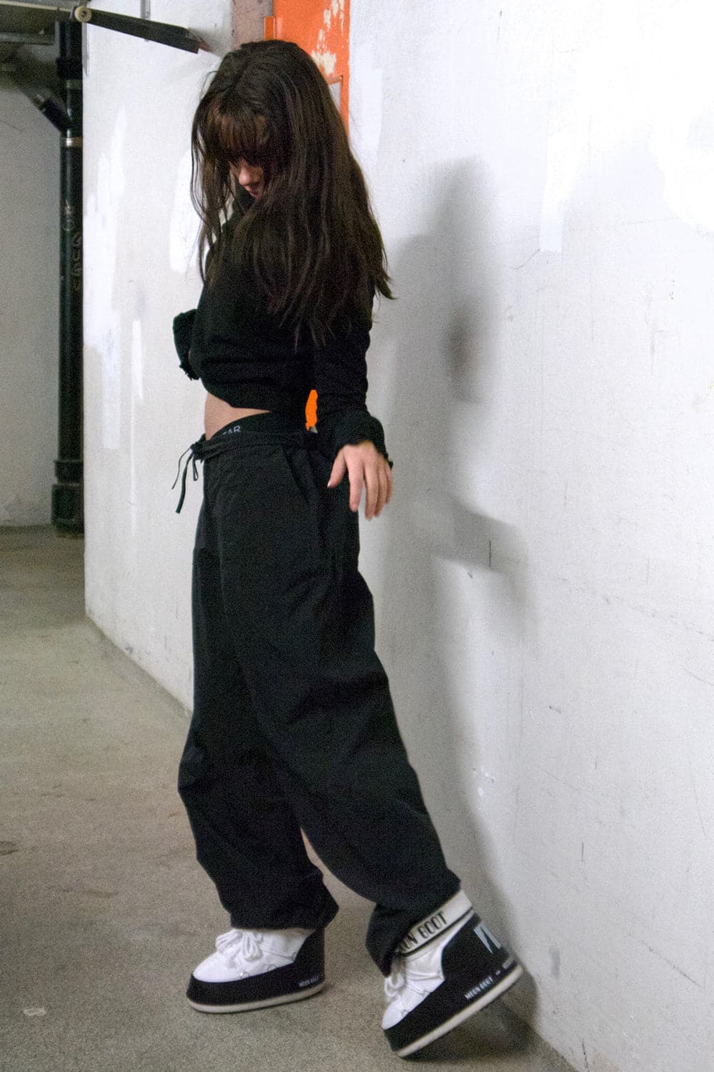 Sorte bukser Lækre sorte bukser, med elastik, knap og bindebånd i taljen, for at sikre en perfekt pasform. Bukserne er nemme at style, da de passer til nærmest alt; Baggy t-shirts, oversized hoodies – you name it! Disse bukser passer perfekt til den hvide